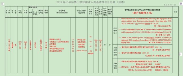 5、博士学位申请人员基本情况汇总表(范本).doc:A3打印,所有信息填写真实完整,论文评阅打分 前三个写盲审成绩,最后一个写明审成绩和明审专家姓名,前面带※号。科研成果栏尽量和报批时保持一致,如有新增成果请提供证明材料。检索论文类必须按 论文题目+杂志名+年卷期:页码+DOI号 填写完整,专利类必须按样本填写!不合格的要重新填写签字。